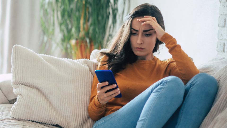 Woman sitting on a lounge looking at her phone contemplating "do I need a mortgage broker"